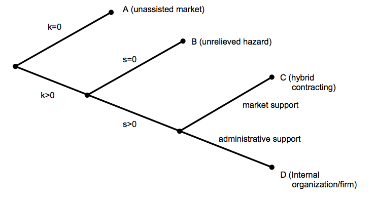 La délégation s'intègre à la théorie des coûts de transaction par le fait que Williamson pose comme central, le problème de l'adaptation des organisations. La délégation est le moteur d'une adaptation efficace : "Delegation is vital to adaptative efficacy." (Williamson, 2006). Quatrièmement, l'économie des coûts de transaction est optimale lorsqu'il y a un alignement entre les transactions et la structure de gouvernance. Cinquièmement, Williamson propose un schéma contractuel simplifié (Figure n.1) et souligne que tout problème contractuel peut être analysé en terme d'économies coût de transaction. Sixièmement, la théorie des coûts de transaction s'appuie sur de solides fondations empiriques. Enfin, septièmement, les politiques publiques ont bénéficié de la théorie dans l'amélioration de leur efficacité.