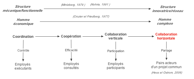 Sous la lentille des théories scientifiques et administratives c'est-à-dire des théories classiques des organisations, la collaboration se limite à de la simple coordination des tâches. Les dirigeants du haut de leur sommet hiérarchique planifient et répartissent les tâches puis contrôlent l'activité de façon autoritaire sans tenir compte pleinement des attentes de leurs subordonnés. On se trouve dans le cas d'un management technique dans lequel selon Déry, les gestionnaires plutôt que de composer avec la complexité humaine, l'ignore en se concentrant avant tout sur la chaîne de commandement où les personnes miment des machines au service de l'efficacité (Déry, Le Management, 2010 p.71). Les fondateurs de la sociologie dont fait partie Durkheim ont très vite pris la mesure des dérives que de telles approches provoquent. Durkheim souligne toutefois que la division du travail à la base du système classique n'est pas mauvaise en soit, car en passant de la solidarité mécanique à la solidarité organique les liens sociaux entre les individus se sont renforcés les rendant plus libres et plus solidaires à la fois (Durkheim, 2007). Ce ne sont dit-il que les formes anormales, les pathologies de la division du travail qui sont néfastes. Barnard sera l'un des premiers à taper dans la fourmilière classique et à donner un nouveau souffle aux théories des organisations en faisant de la coopération l'élément central. À ce stade, on est au début du mouvement des relations humaines au sein de la théorie des organisations, on ne parle plus uniquement de coordination, mais surtout de coopération. Une organisation doit dans ce contexte être efficiente dans l'atteinte de ses objectifs tout en étant efficace dans l'atteinte des motifs des individus qui la composent (Barnard, 1968). Pour générer cette coopération, Barnard a souligné l'importance de la communication formelle et informelle. Likert pour améliorer les performances par la diffusion des savoirs au travers du système coopératif, théorisera un management plus humain incluant une communication multidirectionnelle dont les dirigeants sont les relais (Likert, 1961, 1967). Nous appelons collaboration verticale ce type de coopération qui fait participer les employés, mais leur impose encore une ligne hiérarchique verticale. L'approche de Likert si elle amène une nette amélioration des conditions de travail demeure positiviste dans le sens où tout doit être mesuré et mesurable. Hayek quant à lui considère que certaines choses nous échappent et que pour dépasser nos capacités limitées, il nous faut croire en l'existence d'un ordre spontané qui n'aurait pas été pensé au préalable notamment par les dirigeants (Hayek, 2007). De cet ordre naissent des connaissances tacites dont certaines seront formalisées, mais dont la majorité demeurent invisibles tout en devenant des références au sein de la société qui les a générées. En d'autres termes, Hayek oppose à l'ordre fabriqué et vertical de l'État, l'ordre spontané et horizontal du marché. Pour Crozier et Friedberg les théoriciens nous offrent un cadre formel qui peut nous servir de repère, mais pas de loi (Crozier et Friedberg, 1977, p.280), c'est pour cela qu'au principe de la coopération organisationnelle, ils nous proposent à la place d'une théorie, une méthode d'analyse et de compréhension de la réalité sociale (ibid, p.110) où la coopération est vue comme un jeu de pouvoir. De l’holisme méthodologique aux approches constructivistes en passant par l'individualisme, la coopération à pris une nouvelle dimension due à la complexification de l'organisation et de ses membres. La figure n.2 propose une synthèse de ce chapitre sur l'évolution de la collaboration avec pour point de départ la coordination où les employés sont des exécutants contrôlés par une hiérarchie verticale typique d'une structure mécanique ou l'homme est économique. À un second stade, la coordination devient coopération, on recherche l'efficacité et on consulte les employés. À un troisième stade, la coopération devient collaboration verticale, on sollicite la participation des employés, mais le commandement vient d'en haut. Enfin, à l'ère d'Internet, se dessine une collaboration horizontale basée sur le partage et l'auto-gouvernance entre pairs d'un projet commun (Hess et Oström, 2006). Sur un continuum humain, l'homme économique de Crozier et Friedberg se révèle complexe (Crozier et Friedberg, 1977). Sur un continuum structurel, l'organisation mécanique mintzbergienne ou fonctionnelle chez Nohria, se transforme en structure innovatrice ou réseau (Mintzberg, 2007) (Nohria, 1991). En ce début de XXIe siècle, la verticalité de l'État, des institutions et des organisations rencontre l'horizontalité à laquelle aspirent des individus connectés qu'Hessel invite à s'indigner face aux dérives de la verticalité (Hessel, 2011). Longtemps, l'innovation était philosophique, avec pour objectif de penser des modèles de société. Puis, l'innovation est devenue sociale, elle nous a conduit à repenser nos organisations. Aujourd'hui à l'ère d'Internet, l'innovation est tout autant technologique que sociale, elle nous oblige à repenser nos actes d'organiser, autour d'une collaboration horizontale facilitée par les technologies et dont les acteurs s'auto-gouvernent entre pairs.